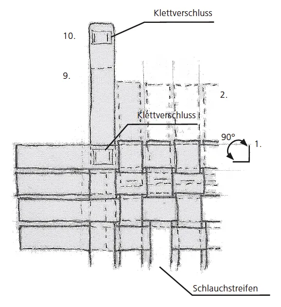 Der Flechtvorgang ist nicht ganz einfach, und man benötigt ein wenig Geduld. Man kann sich die Arbeit etwas erleichtern, indem man die Enden einfach tackert oder besser gleich vernäht, sobald sie in der richtigen Position sind.