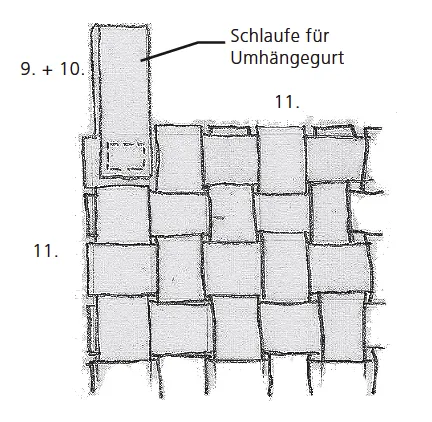 9. Damit Sie die Tasche als Umhängetasche benutzen können, werden jeweils die äußersten Enden nicht verflochten. Diese bilden die Laschen, durch die später das Gurtband gefädelt werden kann.