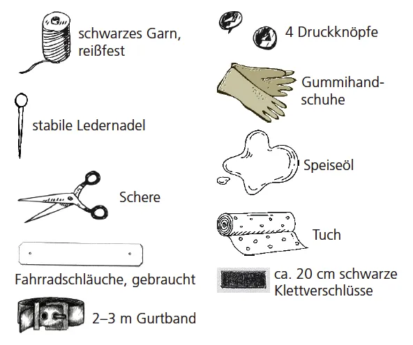 Für diese Tasche benötigen Sie je nach Schlauchumfang und gewünschter Größe 10 bis 20 Schläuche. Das ist natürlich viel mehr, als in einem normalen Haushalt anfallen. Fragen Sie daher im Fahrradgeschäft Ihres Vertrauens nach, ob es möglich ist, für Sie gebrauchte Schläuche zu sammeln – das machen sie dort sicher gern!