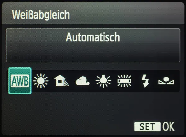 Beispiel einer Kameraeinstellung für den automatischen Weißabgleich sowie vorgegebene Weißabgleichseinstellungen für Sonne, Schatten, Bewölkt und andere.
