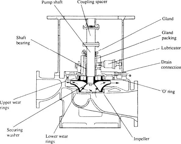 A spigotted coupling spacer connects the motor half coupling to the pump shaft. When this is removed, the pump cover, together with the impeller and shaft assembly can be lifted out of the pump casing for inspection or maintenance.