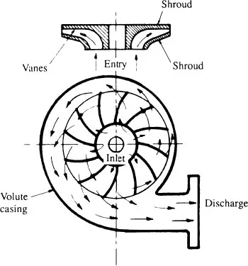 The fully shrouded, single entry impeller in the pump shown (Fig. 1) is the type most widely used. It consists of a number of vanes curving backwards from the direction of rotation. The vanes are supported on one side by shrouding connected to the hub. The shrouding supporting the vanes on the other side, has an entry at the centre. When the pump is operating, liquid in the casing is swirled by the rotating impeller. The swirling action causes the liquid to move towards the outside and away from the centre (in the same way that stirred coffee moves to the side of the cup, tending to spill over the rim and leaves a dip at the centre). The backward curving vanes and the rotation give the liquid a combined radial and circular motion.