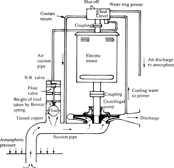 The sealing water reservoir also keeps the air pump cool and is cooled in turn, by a sea water flow through the cooling coils shown. If the water ring temperature rises, then the function of the primer will be destroyed by the presence of water vapour.
