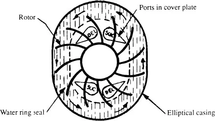 The primer shown, consists of a gunmetal casing of oval shape with a rotor and ported plate, as described for the individual water ring primer. Water in the casing forms a seal and, because it takes up the elliptical shape of the casing when the rotor turns, produces a pumping action. The two suction ports are connected by passages in the cover to the suction pipe from the vacuum tank. The two discharge ports are connected via an aperture to the sealing water tank. Air from the vacuum tank, together with make-up water, is drawn into the suction and discharged to the sealing water tank. The water remains in the tank, while the air passes to atmosphere through the outlet/overflow pipe.