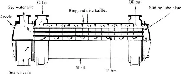 Tube coolers for engine jacket water and lubricating oil cooling are normally circulated with sea water. The sea water is in contact with the inside of the tubes and the water boxes at the cooler ends. Two pass flow is shown in the diagram (Fig. 7) but straight flow is common in small coolers.