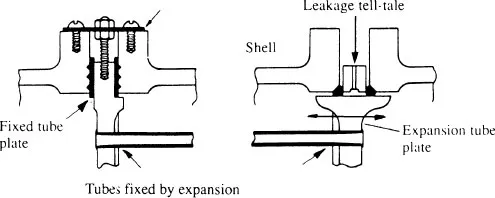 The tube stack shown is fitted with alternate disc and ring baffles. The fixed end tube plate is sandwiched between the casing and the water box. If the joints leak at the other end the special âtell taleâ ring will allow the liquids to escape without mixing. The joint rings are of synthetic rubber.