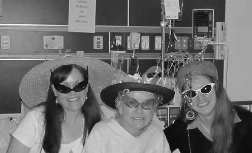 FIGURE 1.2 Brigid (authorâs sister), Mary Lee (authorâs mother), and Anna Leahy (author) in hospital room. Hats worn for the Kentucky Derby. Note the sign indicating the patient should have no cold beverage or food for five days because of side effects of chemotherapy.
