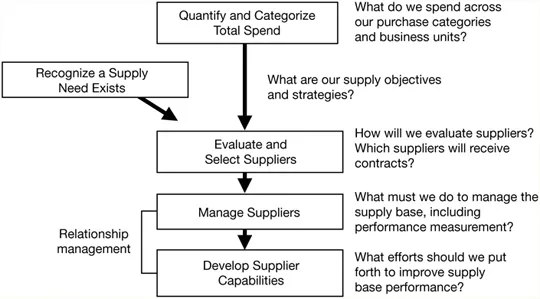 Supply management, on the other hand, is a cross-functional, proactive process for obtaining goods and services that features the active management and involvement of suppliers. The supply management process involves identifying a companyâs total requirements, developing supply strategies, evaluating and selecting suppliers, and then managing and developing those suppliers to realize performance advantages at a level higher than what competitors are realizing. Figure 1.1 presents a broad view of the strategic supply management process.