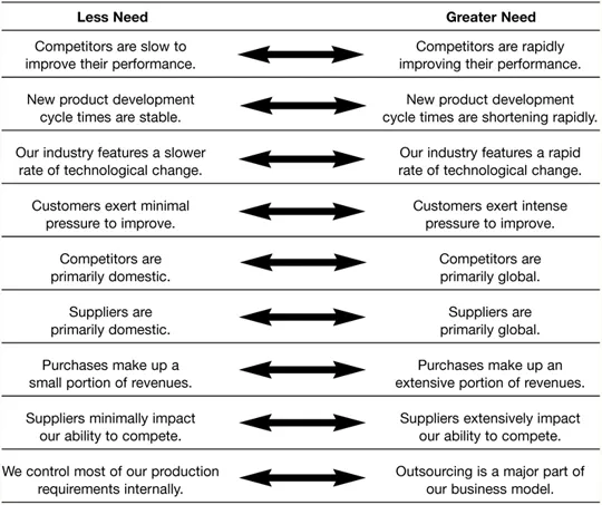 Table 1.1 presents a set of factors that affect how rigorously a company should pursue strategic supply management. Competitive and customer pressure to improve, the rate of change within an industry, the ability of suppliers to impact our competitiveness, and the location of suppliers all affect how seriously a company should endorse strategic supply management. Some companies, such as those in banking or other services, will rightfully not see the potential from strategic supply management the same way as companies in the computer, aerospace, or automotive industries. Todayâs global model features supply chain against supply chain, and for most firms external suppliers are an increasingly important part of their chain. Strategic supply management is a competitive necessity.