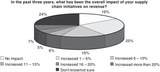 There is a second element to the reported improvements. While cost reduction remains the primary supply chain focus, the 2008 survey also confirmed substantial upward movement in revenue growth influenced by the supply chain (see Figure 1.2) When we asked respondents whether or not supply chain improvements led to new revenues, they again reported increases from 1 to 5 percent to more than 15 percent. In all, 60 percent of the respondents reported some amount of revenue gains attributable to supply chain initiatives. What about the other 40 percent? One fourth of them said they didn’t know or were unsure of such gains, and 16 percent said they saw no impact. In the area of cost savings, 24 percent again said they didn’t know or were unsure of any savings, and 7 percent of the 2008 respondents reported no impact. That means about one third of our global sample is missing the boat when it comes to making the kind of cost gains available. They are missing out on the supply chain’s powerful dual potential of both top line (revenue) and bottom line (cost) improvement.