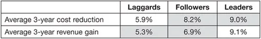 Table 1.1 shows average gains from the combined 2007 and 2008 data. Leaders on average reported 9.0 percent cost savings for a three-year period, whereas laggards show only 5.9 percent gains. The revenue gain for leaders during the same three-year period was 9.1 percent as compared with only 5.3 percent for laggards. We consider these estimates to be highly reliable because the data come from more than 450 companies reporting over two different periods. The evidence further showed that Europe appears to have taken the lead in cost reduction, with one-fourth of the 2008 respondents showing 11 to 15 percent improvement.
