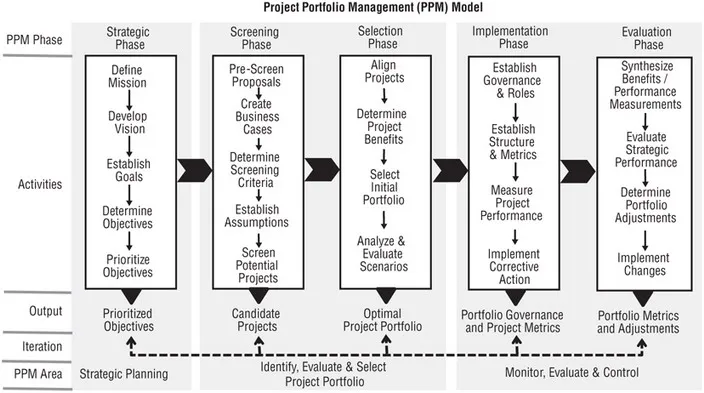 The PPM model conceptually illustrated in Figure 1.1 shows the authorsâ version of the PPM process from strategic planning through portfolio evaluation and adjustment. The model aids in visualizing the PPM process and its integration with the organizationâs strategic planning process; it also shows the connection to identifying, evaluating, and selecting projects for the portfolio and monitoring and controlling the portfolio once implemented. Using the model as a backdrop throughout the book, critical elements of the process show where portfolio decision making increases the chances of achieving strategic goals and objectives; specifically, we describe and demonstrate the processes and tools to prioritize organizational objectives, identify and evaluate candidate projects, select optimal portfolios, and evaluate portfolio performance.