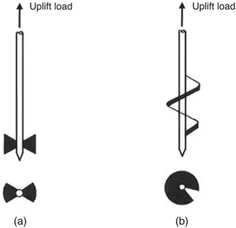 The earlier forms of anchors used in soil for resisting vertically directed uplifting loads were screw anchors. Figure 1.1 shows two different configurations of screw anchors. These anchors were simply twisted into the ground up to a pre-estimated depth and then tied to the foundation. They were used either singly or in groups.