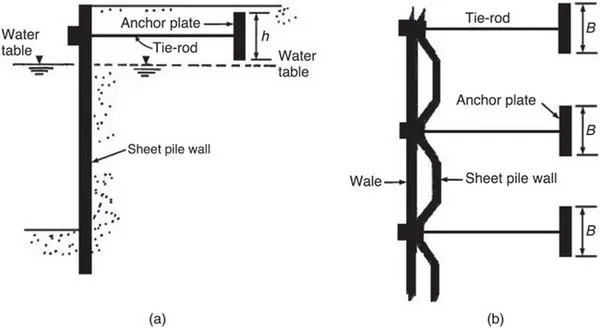 FIGURE 1.4 Use of vertical plate anchor in sheet pile wall: (a) section and (b) plan