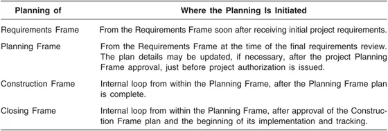 All activities require planning. This includes planning of the Planning Frame, since the Planning Frame activities include plans for high-level design, plans for risk management, plans for quality management, etc. Planning of all project activities and the overall project is always done in the Planning Frame, but may be initiated in other frames. Where the planning of each frame is initiated is shown in Table 5.1.