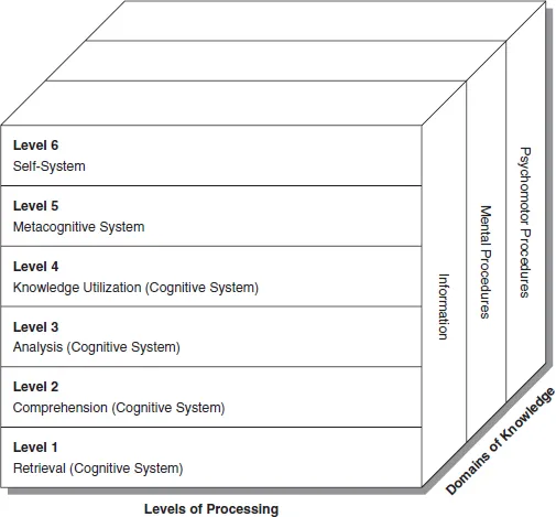 The New Taxonomy can be represented as depicted in Figure 1.1. The rows on the left-hand side of Figure 1.1 represent three systems of thought and in the case of the cognitive system, four subcomponents of that system. The columns on the right-hand side of Figure 1.1 depict three different types or domains of knowledge: information, mental procedures, and psychomotor procedures. In effect, the New Taxonomy is two-dimensional. One dimension addresses three domains of knowledge; the other addresses levels of mental processing.