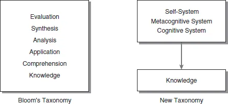 One of the defining differences between Bloomâs taxonomy and the New Taxonomy is that the New Taxonomy separates various types of knowledge from the mental processes that operate on them. This is depicted in Figure 1.2.