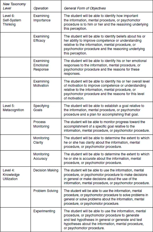 The rows of Figure 1.3 represent the various levels of the New Taxonomy. The third column of Figure 1.3 portrays a generic form of the objectives that might be generated for each level of the New Taxonomy. Subsequent chapters provide specific examples of educational objectives, along with tasks that might be used to assess those objectives, for each level of the New Taxonomy across the three domains of knowledge. To obtain a sense of the objectives that might be generated and assessed using the New Taxonomy it is useful to start with retrieval objectivesâthe bottom of the New Taxonomy.