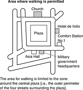 1 The following regulations apply to all matters concerning the management and operation of comfort stations in the area controlled by the Iloilo Office, Visayas Branch, Military Government of the Philippines. 2 The supervision of comfort stations shall be under the jurisdiction of the [local] military government. 3 The medical officer attached to the garrison shall be in charge of supervising hygiene [in the comfort stations]. Venereal disease examinations of women serving clients [there] shall take place on Tuesday of each week at 15:00. 4 Use of the comfort stations shall be restricted to uniformed military personnel and civilian employees of the military. 5 Comfort station managers shall scrupulously observe the following provisions. 1) Bedding in the buildings shall be kept clean and disinfected by exposure to sunlight. 2) Facilities shall be fully equipped for cleansing and disinfecting [to prevent the spread of venereal disease]. 3) Clients who do not use condoms shall be prohibited from availing themselves [of these facilities]. 4) Unwell women are prohibited from serving clients. 5) Comfort women shall be strictly supervised to ensure they do not leave the premises. 6) Women shall bathe daily. 7) All entertainment not covered by these regulations is prohibited. 8) Comfort station managers shall submit a report of daily business activities to military government authorities. 6) All personnel intending to use the comfort stations must strictly abide by the following rules. 1) Absolute vigilance must be exercised to safeguard intelligence [useful to the enemy]. 2) Comfort women and housemasters shall not be subjected to violence or intimidation. 3) All fees must be paid in advance in military script. 4) Clients must use condoms, scrupulously maintain personal hygiene, and do their utmost to avoid contracting a venereal disease. 5) It is strictly forbidden to take comfort women off the premises without permission from the Iloilo Office, Visayas Section, Military Government of the Philippines. 7 Comfort women shall be permitted to take walks every day between the hours of 8 a.m. and 10 a.m. If they wish to do so at other times, they must have permission from the Iloilo Office, Visayas Branch, Military Government of the Philippines. Furthermore, they are required to remain within the area shown in Figure 1.1 below. 8 Use of the comfort stations is restricted to personnel holding an authorized military pass (or its equivalent). 9 The comfort stationsâ hours of operation and fees are to be posted separately. |