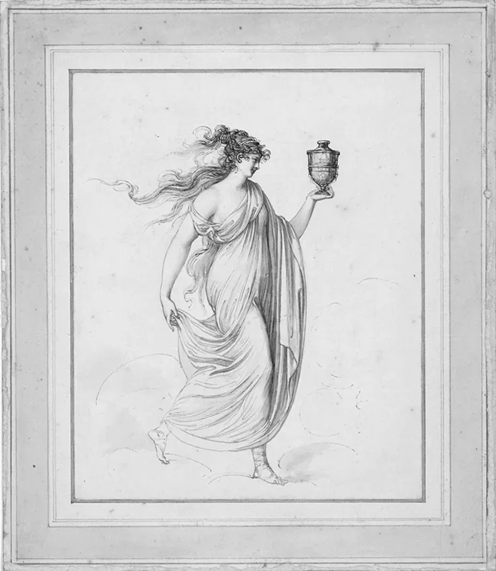 The vase that Emma holds in Cosway’s drawing is unusual. Carefully rendered and the object of her gaze, it is clearly meant to be significant to the meaning of the image. But Hygeia is not usually represented holding a vase. Her attribute is a snake, which she is occasionally shown feeding out of a shallow bowl. The vase seems to have a lid, making it a type of pyxis,3 a container in which we might have found the ointments and salves that Graham promised would provide youth, renewed sexual vigour, and cures for all manner of ills. In ancient times, pyxides were often decorated with marriage scenes, an iconography that would have fitted with Graham’s purposes. That the vase is a pyxis suggests that Emma is represented not as Hygeia but as Hebe Vestina, “the rosy goddess of youth and health,” a divinity that Graham had invented for his Temple. (A transcription of Hebe Vestina’s lecture at the Temple of Health was published in 1782 anonymously, though almost certainly authored by Graham himself, under the title Il Convito Amoroso! Or, a Serio-comico-philosophical Lecture on the Causes, Nature, and Effects of Love and Beauty … As Delivered by Hebe Vestina! The Rosy Goddess of Youth and Health! …). Her name is a combination of Hebe, the Greek goddess of youth, cupbearer to the gods, and Vestina, a name derived from Vesta, the Roman goddess of the hearth.