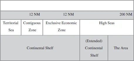 In the category of implicit or explicit principles, norms, rules, regulations, rights, duties and decision-making procedures, the LOS Convention is considered the âConstitution for the Oceans,â replacing the old law of the sea loosely bound by a few simple rules such as the freedom of the high seas.21 As the core component of the LOS regime, it brings legal breakthroughs to many fronts in the maritime domain, and provides a comprehensive, internally cohesive, legal framework for ocean governance. The Convention establishes five major zones for the world seas, each governed by a very specific set of rules and regulations: (1) the Territorial Seas and Contiguous Zones; (2) the Exclusive Economic Zone (EEZ); (3) the Continental Shelf (CS); (4) the High Seas; and (5) the Area (see Figure 1.2). The Convention develops new legal concepts, principles, and obligations that are now in everyday use and revised the content of many old concepts including, inter alia, common heritage of mankind (CHM), freedom of navigation (FON), provisional arrangement and Dispute Settlement. In particular, the concepts of EEZ and CS have been influential in reshaping Chinaâs legal position on its sovereignty in the South China Sea.