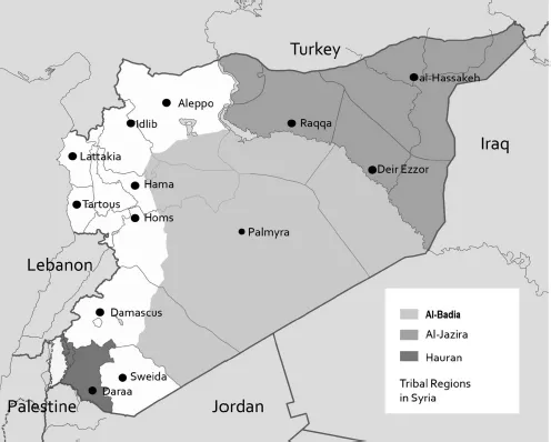 The tribes studied in this book inhabit four geographical regions of Syria. These four regions include al-Badia (Arabic: āthe Steppeā), al-Jazira (Arabic: āthe Islandā), Hauran and the Syrian part of the Golan Heights in the countryside of Quneitra. These four regions will be known as āthe tribal regionsā in this study. Each of these regions will be described briefly below: