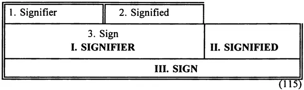 The first level sign (3) which exists as the relationship between signifier and signified becomes the second level signifier (III) in this operation. It is emptied of historical signification of the relationship it expressed at the level of language.