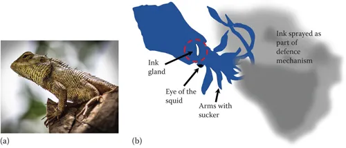 Smart responses from nature. (a) Chameleon changes its color corresponding to the environment (courtesy of WhitelilyāPixabay [CC0 Creative Commons]). (b) Squid ejecting ink to escape from its predators.