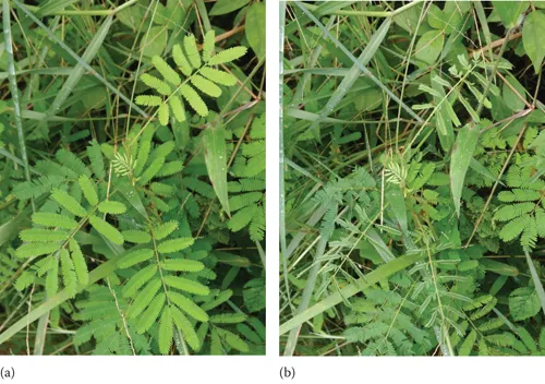 Stimuli response from nature. (a) M. pudica plant leaf open. (b) Leaves close in response to touch; the receptors present in the plantās body are activated by an alteration or modification of the plantās shape.