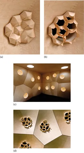 The concept is based on grain direction and the bending stiffness of thin wooden flaps that can absorb air moisture and expand. This opens up the possibility of regulating the perfect living conditions, requiring no human intervention. Figure 1.3a,b depicts the closed configuration and the open configuration for less humid and considerably more humid conditions, respectively, by expanding along the absorbed side to open the thin wooden flaps. Figure 1.3c,d shows the internal and external view of the HygroSkin, respectively, for varied humidity conditions. Thus, by sensing environmental changes, the material responds or actuates to achieve a functional requirement. This is an example of the stimuli-responsive concepts that have evolved as the building blocks of smart structures.