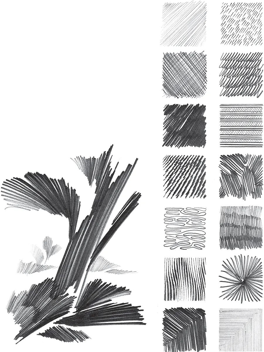 Closely related to paper surfaces and the natural variety of strokes produced by them are the multitude of strokes which can be devised to indicate textures of various objects, such as grass, stone, leaves, water, etc. These are limited only by the creativity of the artist and their appropriateness to the subject being depicted.