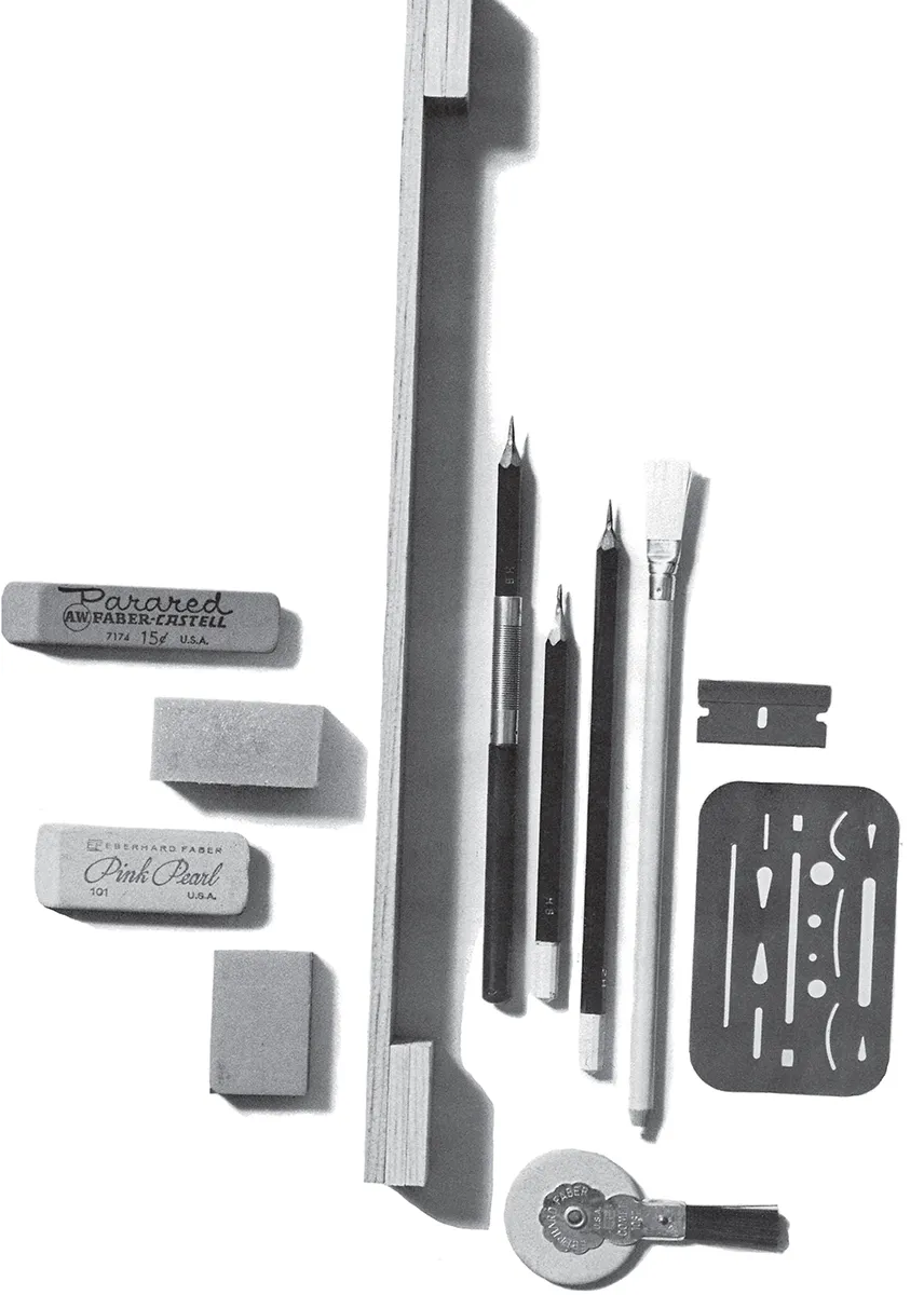 In very small and tightly confined areas, I find the employment of a masking shield to be an invaluable asset. It enables you to control the sweep of the erasure and protects and maintains the areas of the drawing you want to remain intact. The masking shield can be purchased at any well-equipped art supply or stationery store and should be part of your material supplies.
