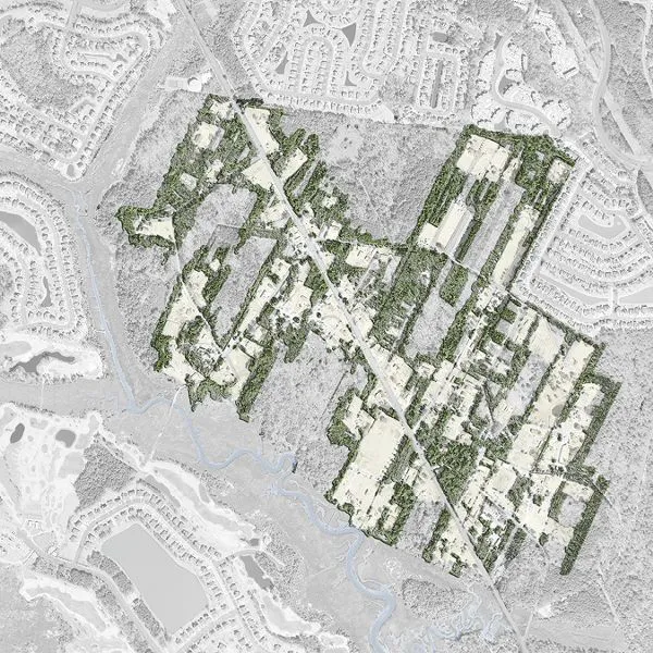 The Lifeways plan illustrates how the cultural and ecological history of a place can inform existing and new landscape patterns. The historic lot lines running perpendicular to Horlbeck Creek were planted to become fifteen-foot easements to enable drainage, provide new tree patches, and allow free play for neighborhood kids. (Hood Design Studio, Phillips Lifeways Plan, Mount Pleasant, South Carolina, 2006)