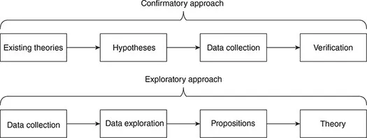 When you conduct research in a given domain, broadly speaking, you can go about it in two general ways: a confirmatory hypothetico-deductive or exploratory inductive approach (see Figure 1.1).