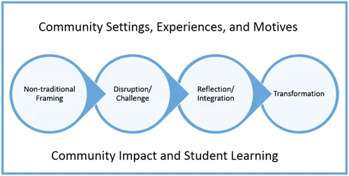 What is in a name? When describing CBTL, the name requires nontraditional pedagogical practices, incorporates community engagement that serves community needs, integrates reflective practice, and embraces challenging and disruptive aspects that lead students to a broader understanding of their role in the community (see Figure 1.1). Although many aspire for service learning and CBL to reach transformational outcomes, teaching practices implemented at the higher education level do not always achieve these objectives. For example, students who experience a disruptive experience in the community-based setting but who do not have structured reflection around those experiences could end up reinforcing prior stereotypes about people in the community who are different from themselves (Endres & Gould, 2009; Mitchell, Donahue, & Young-Law, 2012).