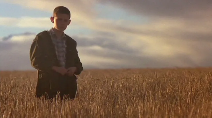 Then, close to halfway through the film, there is a scene in which the protagonist, a young boy, is exploring a partially built house. At a certain point, he peers into a room and sees on the far wall a view of a bright golden cornfield, framed by an opening that will one day be a window (p. 64). As the camera slowly tracks forward, the character, seen from behind, enters frame left. The forward movements of camera and character towards the view continue; the boy jumps up onto the window sill. The movement halts briefly as the boy is silhouetted against the bright field. As he jumps down to the other side, the movement resumes as, slowly, the edges of the window opening merge with, and then disappear beyond, the edges of the film frame, and the entire screen is filled with the dazzling golden field and blue sky.