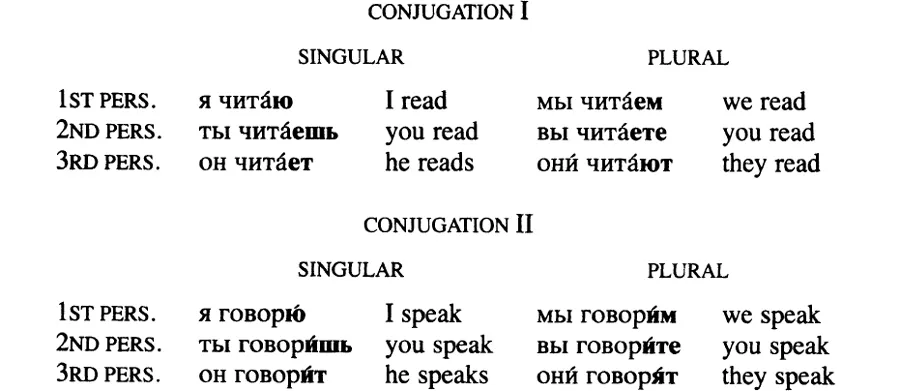 In the present tense, the overwhelming majority of Russian verbs have a different ending for each of the personal pronouns. These endings are added to the stem after dropping the -ть of the infinitive (and often the vowel preceding the -ть). There are two chief sets of these personal endings. In Conjugation I, e is the characteristic vowel of the endings, appearing in the forms for ты, он (or онá or онó), мы and вы. In Conjugation II, the characteristic vowel in the corresponding endings is и. Our model verb for Conjugation I will be the imperfective verb читáть (“to read”); for Conjugation II, the imperfective verb говор