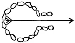 Out on the Ceriso about five miles, and wholly out of sight of it, near where the immemorial foot trail goes up from Saline Flat toward Black Mountain, is a water sign worth turning out of the trail to see. It is a laid circle of stones large enough not to be disturbed by any ordinary hap, with an opening flanked by two parallel rows of similar stones, between which were an arrow placed, touching the opposite rim of the circle, thus (Fig. 1), it would point as the crow flies to the spring. It is the old, indubitable water mark of the Shoshones. One still finds it in the desert ranges in Salt Wells and Mesquite valleys, and along the slopes of Waban. On the other side of Ceriso, where the black rock begins, about a mile from the spring, is the work of an older, forgotten people. The rock hereabout is all volcanic, fracturing with a crystalline whitish surface, but weathered outside to furnace blackness. Around the spring, where must have been a gathering place of the tribes, it is scored over with strange pictures and symbols that have no meaning to the Indians of the present day; but out where the rock begins, there is carved into the white heart of it a pointing arrow over the symbol for distance and a circle full of wavy lines (Fig. 2) reading thus: āIn this direction three [units of measurement unknown] is a spring of sweet water; look for it.ā