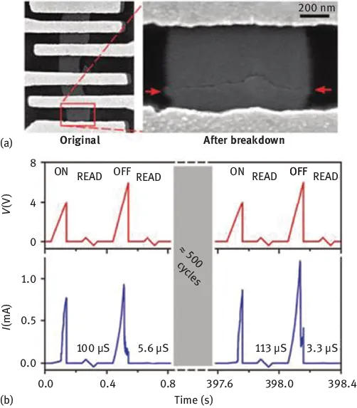 After cycling the memories, they observed that the resistance values clearly changed as a function of the voltage (see Figure 1.1b): they moved from a high resistance state (off state) to a lower one as a function of the voltage (on state). This effect was nonvolatile and the devices were cycled thousands of writing cycles (105), showing long retention times (more than 24 h, only limited by measurements).