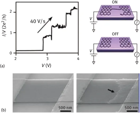 The first paper highlighting the utilization of graphene for resistive NVM exploiting two terminal structures was issued in 2008 by Stadley et al. at Caltech [27]. They reported the development of an NVM element based on graphene break junctions. These junctions were obtained by achieving two-terminal devices, transferring graphene sheets on SiO2/Si substrate and depositing metal electrodes on them using e-beam lithography process. After applying a specific voltage under ultravacuum condition (10ā7 torr), they were able to create a break in the graphene layer (see Figure 1.1). In these papers, all the measurements were performed under ultravacuum to avoid environmental gas interferences, which strongly reduces the potential utilization of the device.