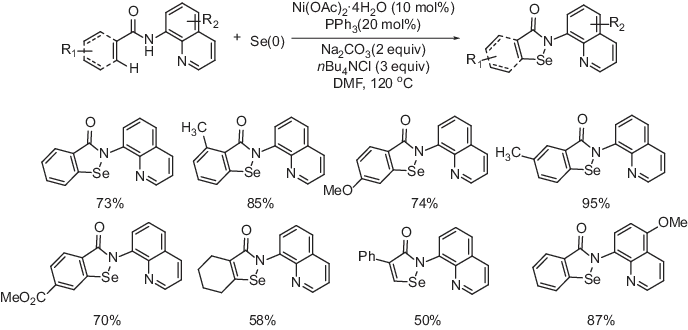 In this context, Nishihara and coworkers reported the synthesis of benzoisoselenazolone and its derivatives by nickel-catalyzed dehydrogenative direct selenation of C(sp2)âH bonds with elemental selenium powder under aerobic condition (Scheme 1.1) [16]. After optimization it was observed that a combination of 10 mol % of Ni(OAc)2¡4H2O, 20 mol % of PPh3, 2 equiv. of Na2CO3 and 3 equiv. of n-Bu4NCl along with 2 equiv. of selenium powder in DMF at 120 °C under air provided the best results among others. A range of functional groups including both electron-donating and electron-withdrawing substituents were compatible under the optimized oxidative conditions and the corresponding benzoisoselenazolone derivatives were formed in good-to-excellent yields. Apart from benzamides, acrylamides were also found to be suitable for the desired transformations. The newly formed benzoisoselenazolone derivatives were readily converted into a variety of useful organoselenium compounds. Based on the control experiments, the author proposed a mechanistic cycle that the reaction proceeds by the formation of nickelacycle(II) and single-electron oxidation of the stable nickelacycle(II) species under aerobic condition.