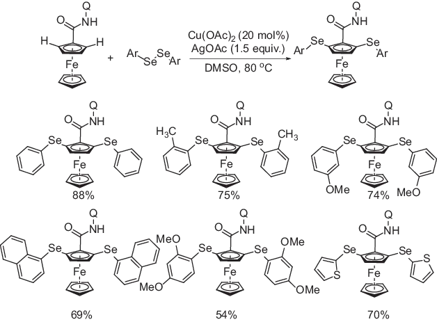 Synthesis of unsymmetrical ferrocene aryl chalcogenides by CâH activation of ferrocene amide using 8-aminoquinoline as a directing group has been developed by Sattar et al (Scheme 1.2) [17]. The reaction occurs in the presence of copper(II) salt as the active catalyst, silver acetate as an oxidant at 80 °C in DMSO. A range of diaryl diselenides containing electron-deficient and electron-withdrawing substituents underwent successful coupling with ferroceneamide under the optimized reaction conditions and the bis-arylselenylated ferrocenes were obtained. Although the reactions successfully produced the desired arylselenylated ferrocene using diaryl diselenides, dialkyl diselenides failed to initiate the reaction. The reaction went smoothly with other diaryl dichalcogenides too.