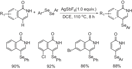 C-4 Selenylated isoquinolin1(2H)-one was synthesized using a new and facile AgSbF6-mediated procedure through a radical pathway (Scheme 1.3) [18]. The reaction occurs in the presence of equimolar amount of isoquinolin-1(2H)-ones and diaryl diselenide using AgSbF6 as an oxidant in dichloroethane under reflux for 8 h. Among several other commonly used oxidizing agents, AgSbF6 was found to be the most effective one. The reaction shows excellent regioselectivity and broad substrate scope. The corresponding C-4 selenylated derivatives were obtained in excellent yield. Apart from isoquinoline moiety, the reaction occurs without any difficulty when pyridin-2(1H)-one was used.