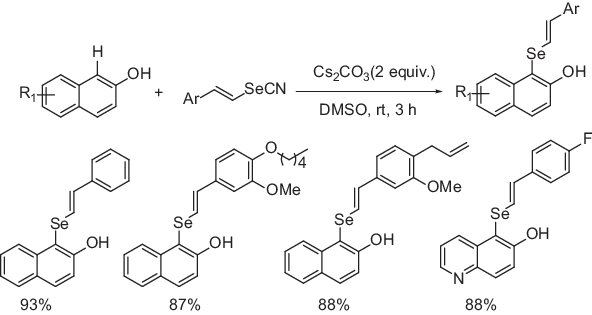 As recently reported by Ranu and his coworkers, when 2-naphthol and its derivatives were allowed to react with styrenyl selenocyanate/diaryl diselenide in the presence of a base at room temperature, selenylation occurs selectively at the 1-position of 2-naphthol unit (Scheme 1.4) [19]. The reaction occurs in the presence of Cs2CO3 as a base in DMSO solvent at room temperature in the absence of any transition metal or oxidants. Both electron-donating and electron-withdrawing styrenyl selenocyanate reacted with 2-naphthol and its derivatives at room temperature and the corresponding 1-styrenyl-selenylated naphthol derivatives were obtained in good yields (Scheme 1.4a). The electronically diverse diaryl diselenides also provided the desired 1-arylated derivatives without any difficulty (Scheme 1.4b). The reactions are relatively fast (2â4 h) and high yielding. The reaction is also feasible in gram scale. More importantly, the unaffected hydroxyl group (âOH) can be further functionalized. Initially, the base Cs2CO3 reacts with 2-naphthol to form naphtholate anion intermediate (A) (Scheme 1.4c), which reacts with styrenyl selenocyanate/diryl diselenide at the 1-position to form the species (B). The intermediate (B) then undergoes aromatization via proton elimination to form the desired 2-selenylated product.