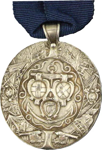 This medal may possibly be regarded as the first attempt at a standardised system of awards for distinguished service. In 1649, Parliament decreed that an amount of prize money (from the capture and sale of enemy ships) be set aside for the production of medals to reward âextraordinary serviceâ at sea, initially for actions off Holland. The small, oval medals, designed by Thomas Simon, were struck in gold and silver. They depicted on the obverse shields bearing the Cross of St George (for England) and the Harp of Erin (for Ireland) on either side of an anchor, the whole surrounded by a rope border, below the word Meruisti (âYou have meritedâ). The reverse showed Parliament in session in the House of Commons. Original examples are very rare, but later restrikes are known.
