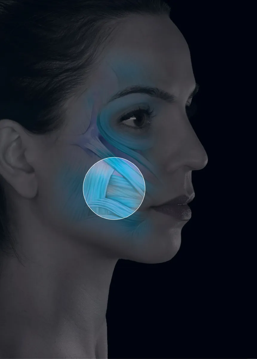 | The muscles of facial expression are not covered by a fascia; they originate and/or insert directly into the skin, thereby pulling the skin during muscle contraction. In order to find these muscles, patients are asked to make a specific facial expression that makes their position predictable. | The muscles of mastication are covered by a fascia that isolates them from the skin. Therefore, they do not cause skin wrinkles and/or mimicry. During contraction, their volume is noticeable through palpation. | Some muscles are not noticeable through palpation or facial expressions. A better way to find them would be to make drawings over the bones and other anatomical structures. Doing so will create esthetic references that will help to locate the muscles. |