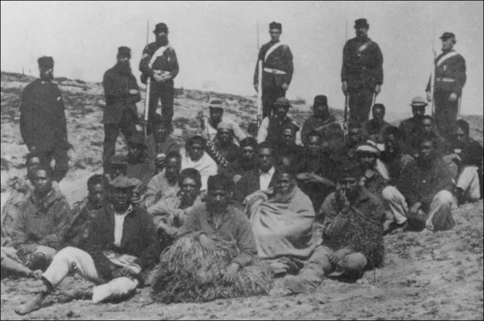 Guarded by soldiers, Hauhau men captured in the fighting on the East Coast await their fate at Ahuriri. Many were banished to Wharekāuri (the Chatham Islands).