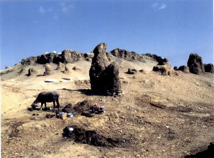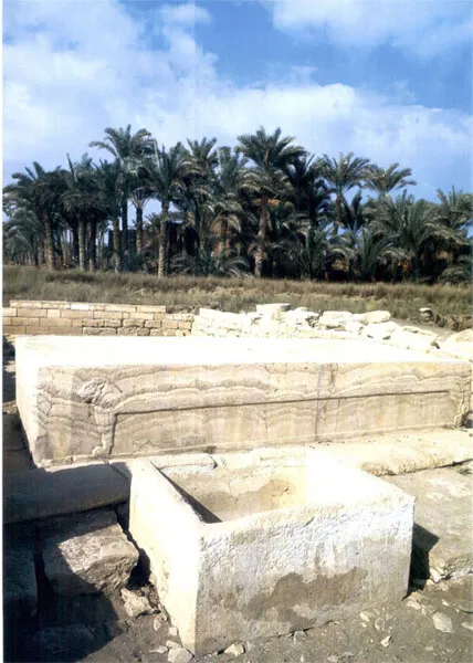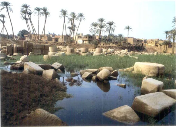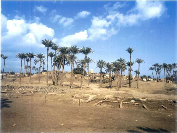 Meni, the legendary unifier of Egypt and founder of the First Dynasty, who is credited with the founding of Memphis, could scarcely have chosen a more suitable site on which to build an administrative center for the newly established state. He selected a place on the southern bank of the Nile near the point at which the river valley spreads out into its delta. Just a few kilometers to the north, the Nile, whose course has shifted three kilometers east over the last five thousand years, divides into the branches that determine the basic shape of the Delta. To the east and west the narrow, rocky banked valley, is surrounded by the immense desert. The city which Meni founded was called Ineb(u) hedj, âThe White Wall(s),â perhaps because the ramparts of the stronghold which at the same time served as the royal residence, were white. The precise site of this historic center of Memphis has not yet been located with any certainty, although the latest British archaeological researches, using deep-hole drilling, have indicated that it could lie under the northern part of the present-day village of Mit Rahina. At any rate, the remains of âthe White Wallâ and of later Memphis, lie under several meters of Nile mud.