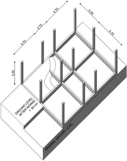 The construction process is therefore very rapid and requires many laborers. After drawing out the limits of the plot, four or five carpenters build the formwork out of wooden board for foundations (Fig. 1.4). The iron framework is erected immediately afterward, on the same day. Then about twenty workers mix and pour the concrete into the foundations. It takes two days and about ten workers to cast the posts that support the first floor, to cast the floor itself, and fill the framework with concrete blocks.6 All openings are walled up immediately, and the front door is fitted to ensure the safety of the equipment that will be stored inside for the duration of the building work. The whole operation takes between three and five days. Props to support the upper floor are kept in place for a week for the concrete to set. The rest of the building is then completed, either by specialized professionals (carpenters, electricians, and plumbers), or by the future occupant. This second stage can take much longer, depending on the financial means of the future occupant.