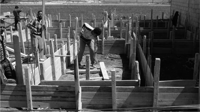 Fig. 1.4: Carpenters building formwork out of wooden board for foundations. Photograph by Etienne Léna.